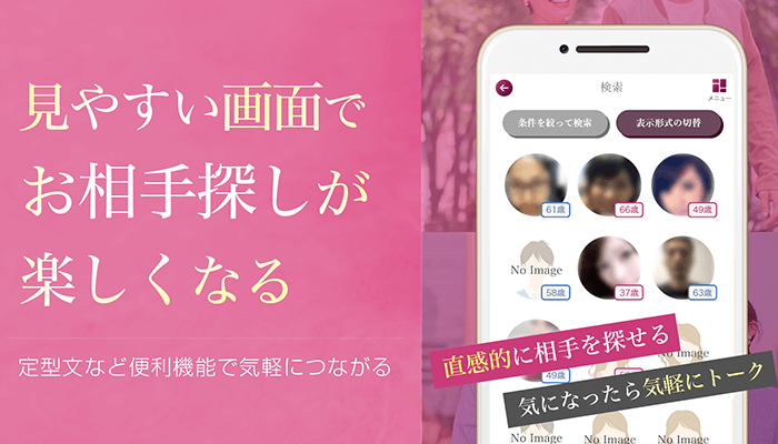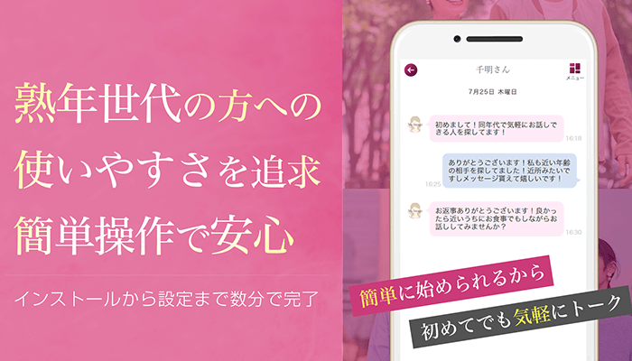わずらわしい設定は一切不要、アプリのインストールからプロフィールの設定まで数分で完了しますのでスマホ操作に慣れていない方でも楽しんでご利用できます。また仮名でも利用可能で安心安全も保障しています。