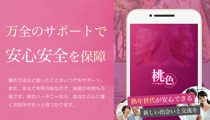 万全のサポート体制で、中高年や熟年世代、アプリに不慣れな方でも安心してご利用頂ける環境をご提供します。新しい人生を桃色に染める場、それが「桃色ハーモニー」 昭和時代の活気ある時代を体験したあなたが、いま再び主役となってみませんか?
